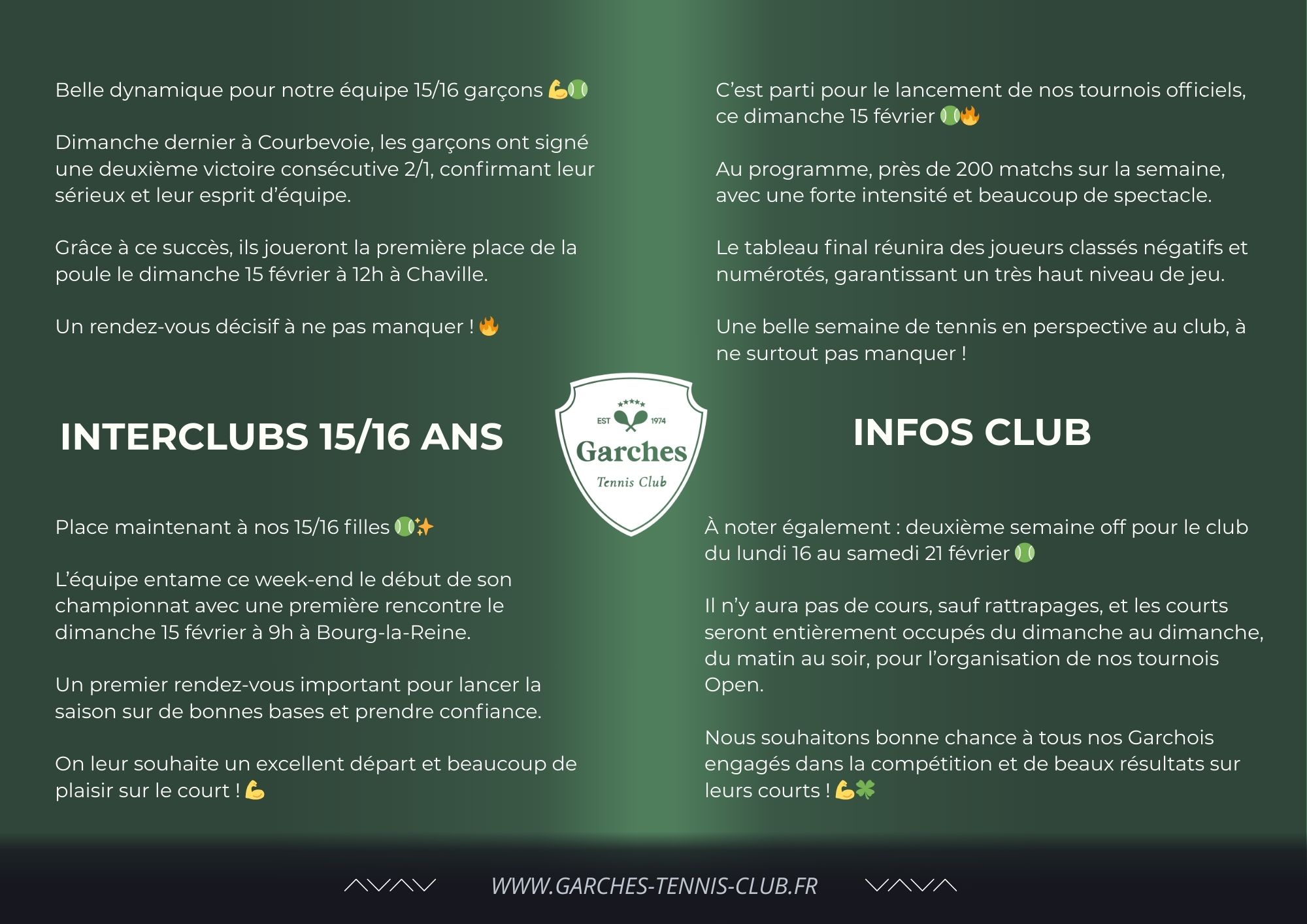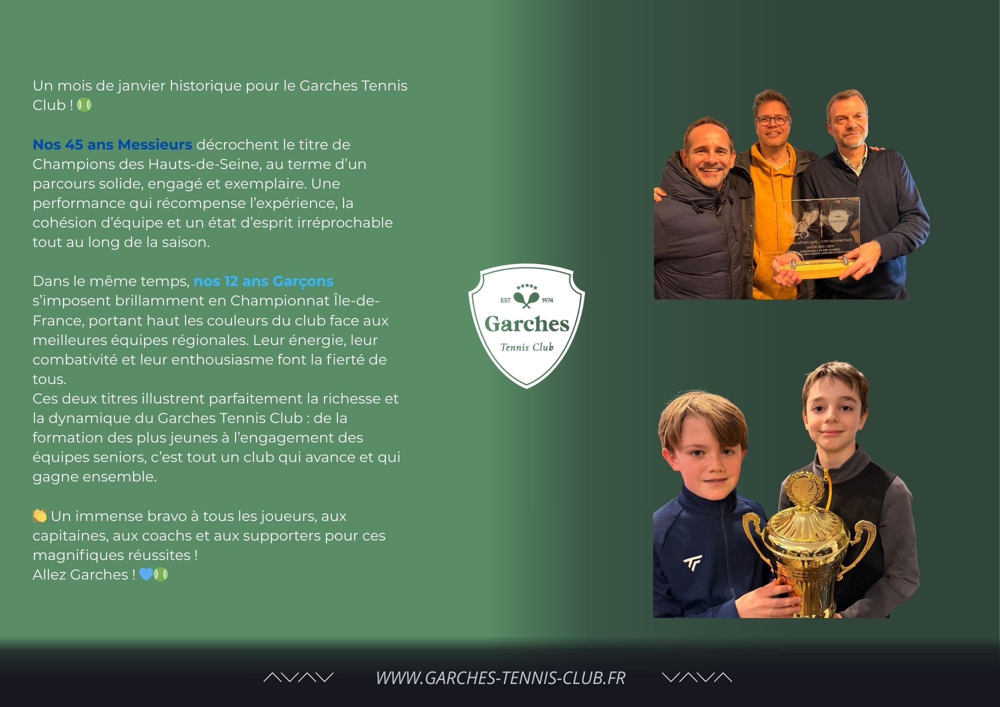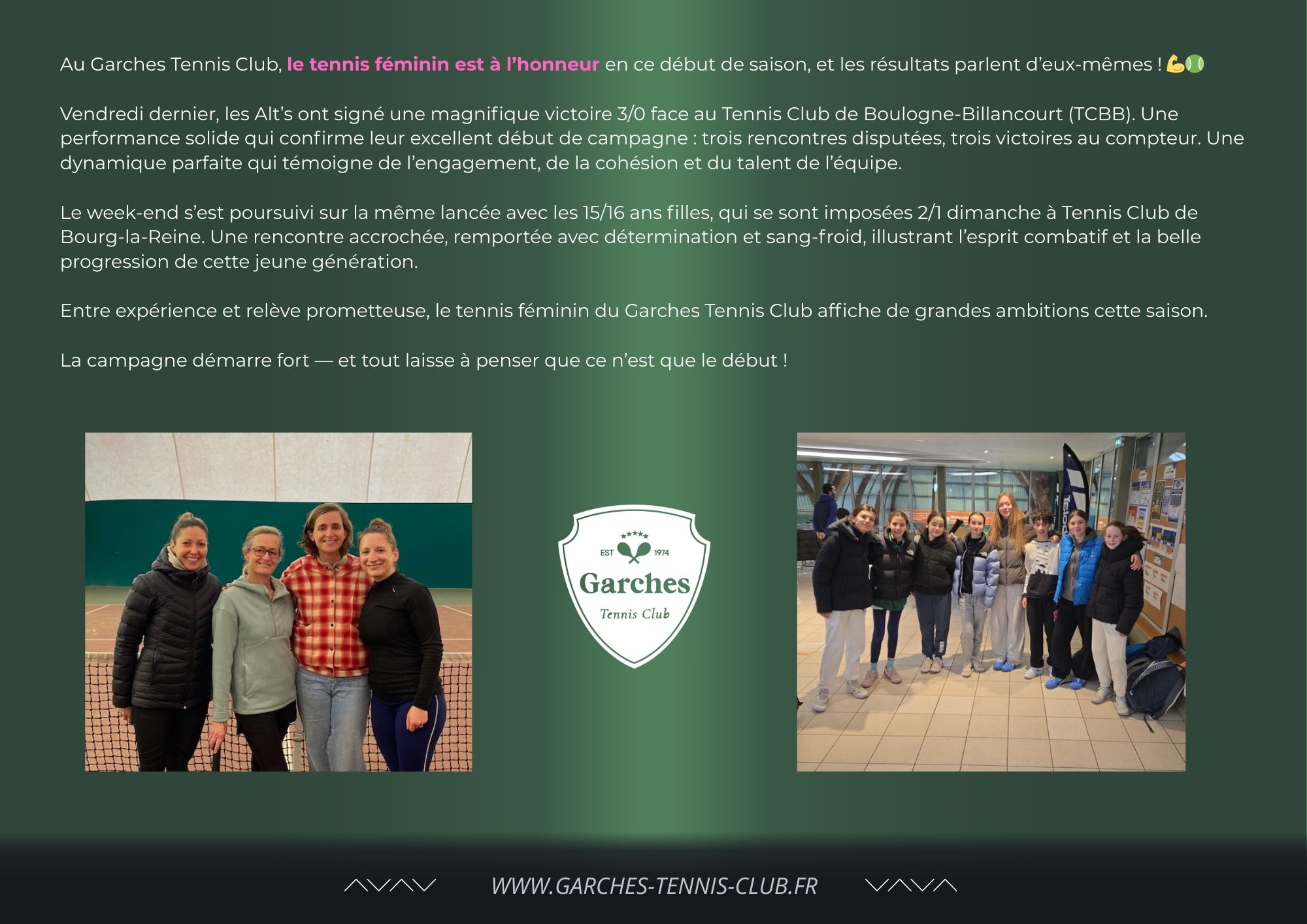 Quel que soit votre objectif, loisir, progression ou performance , le Garches Tennis Club vous offre un encadrement de qualité dans un environnement convivial et bienveillant.